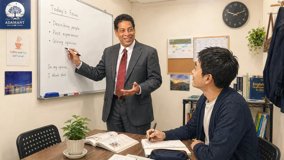 Adamant English Schoolが目指すのは、ただ英語を勉強する場所ではなく、実際のコミュニケーションに近い形で英会話を身につけられる場所。堅苦しい空気や一方通行の授業ではなく、話し、聞き、考え、少しずつ自分の言葉で伝えられるようになる過程を大切にしている。